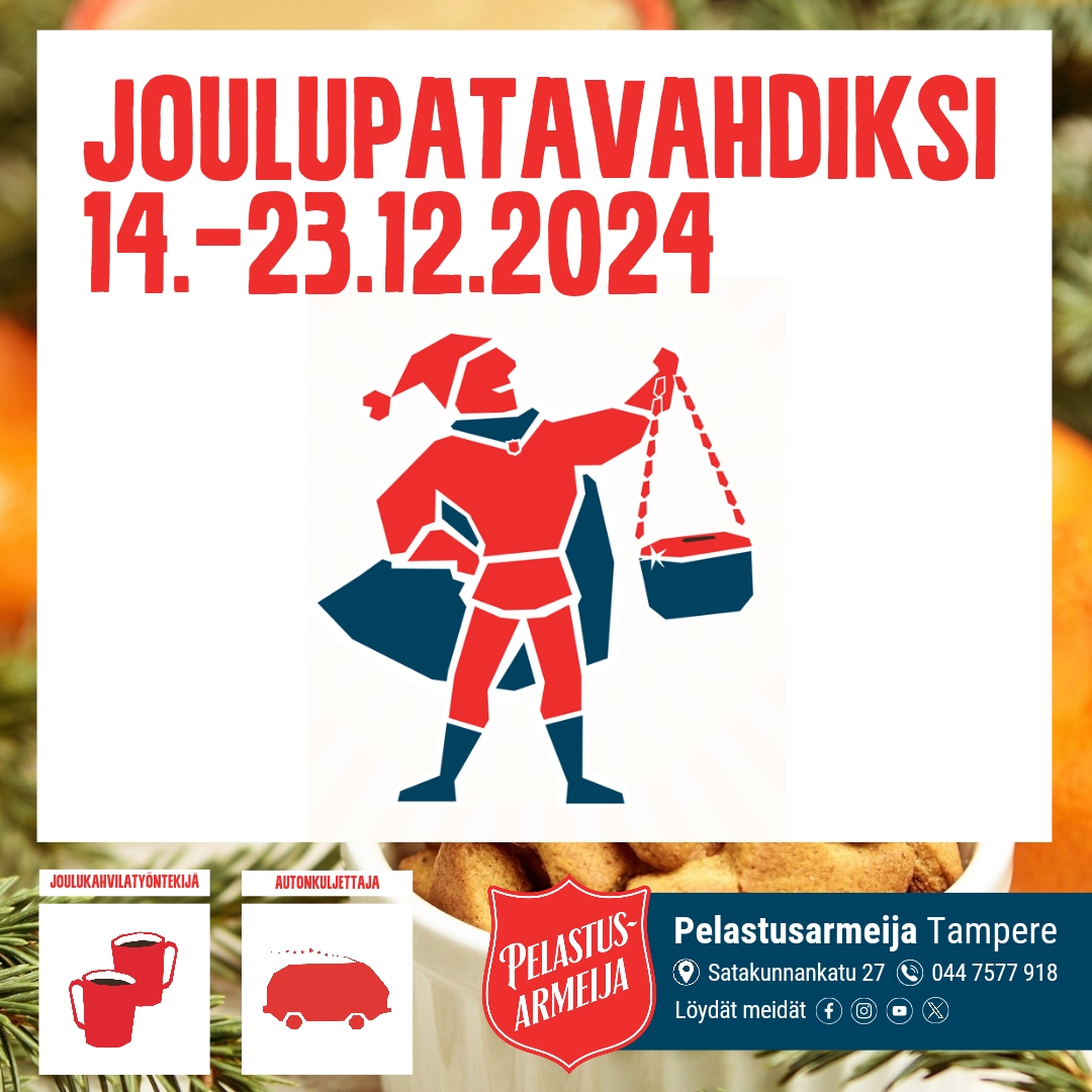 Järjestämme kaikille patavahdin vapaaehtoistehtävästä kiinnostuneille infotilaisuuden keskiviikkona 20.11. klo 18 Pelastusarmeijalla os. Satakunnankatu 27, Tampere. Tilaisuudessa kerromme keräyksestä ja joulupatavahdin tehtävästä. Osallistuminen tilaisuuteen ei sido vielä mihinkään. Halutessasi voit tilaisuuden yhteydessä varata omat vuorosi. Tervetuloa.