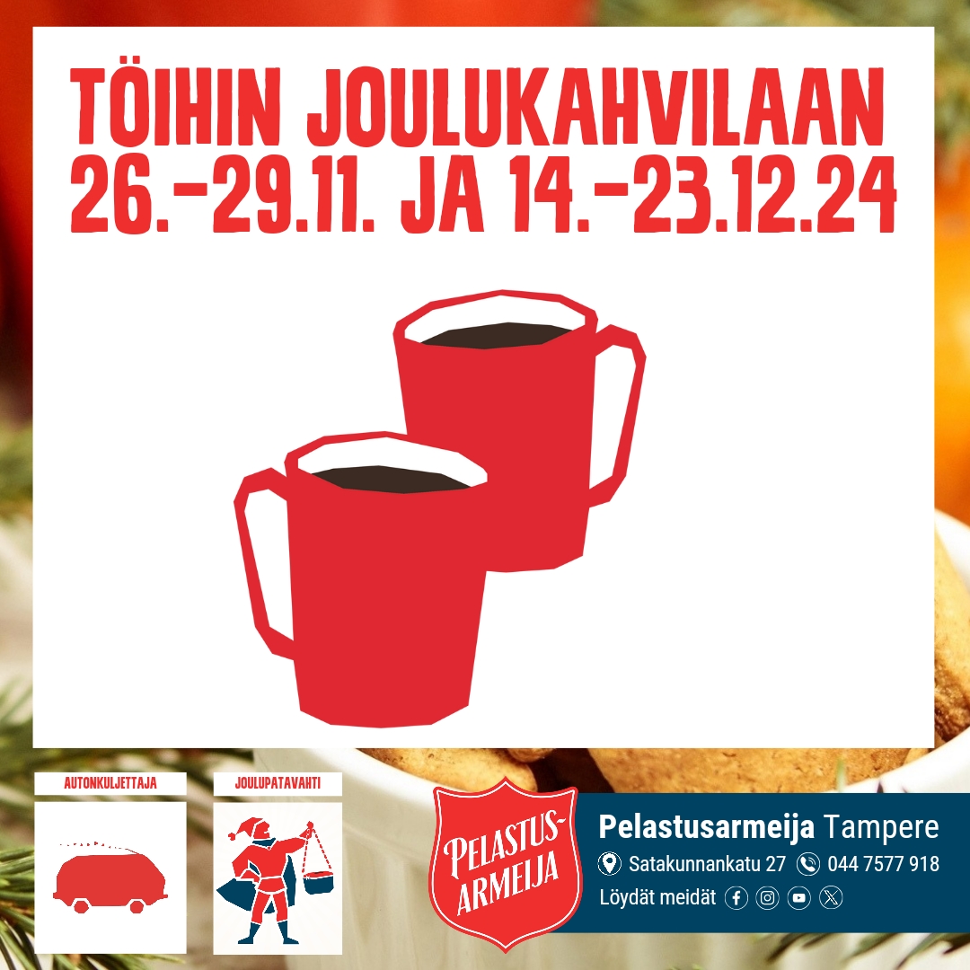 Etsimme joulukahvilaan vapaaehtoisia tuomaan iloa jouluavustuksen Pelastusarmeijalta saaville sekä vapaa ehtoisille joulupatavahdeille