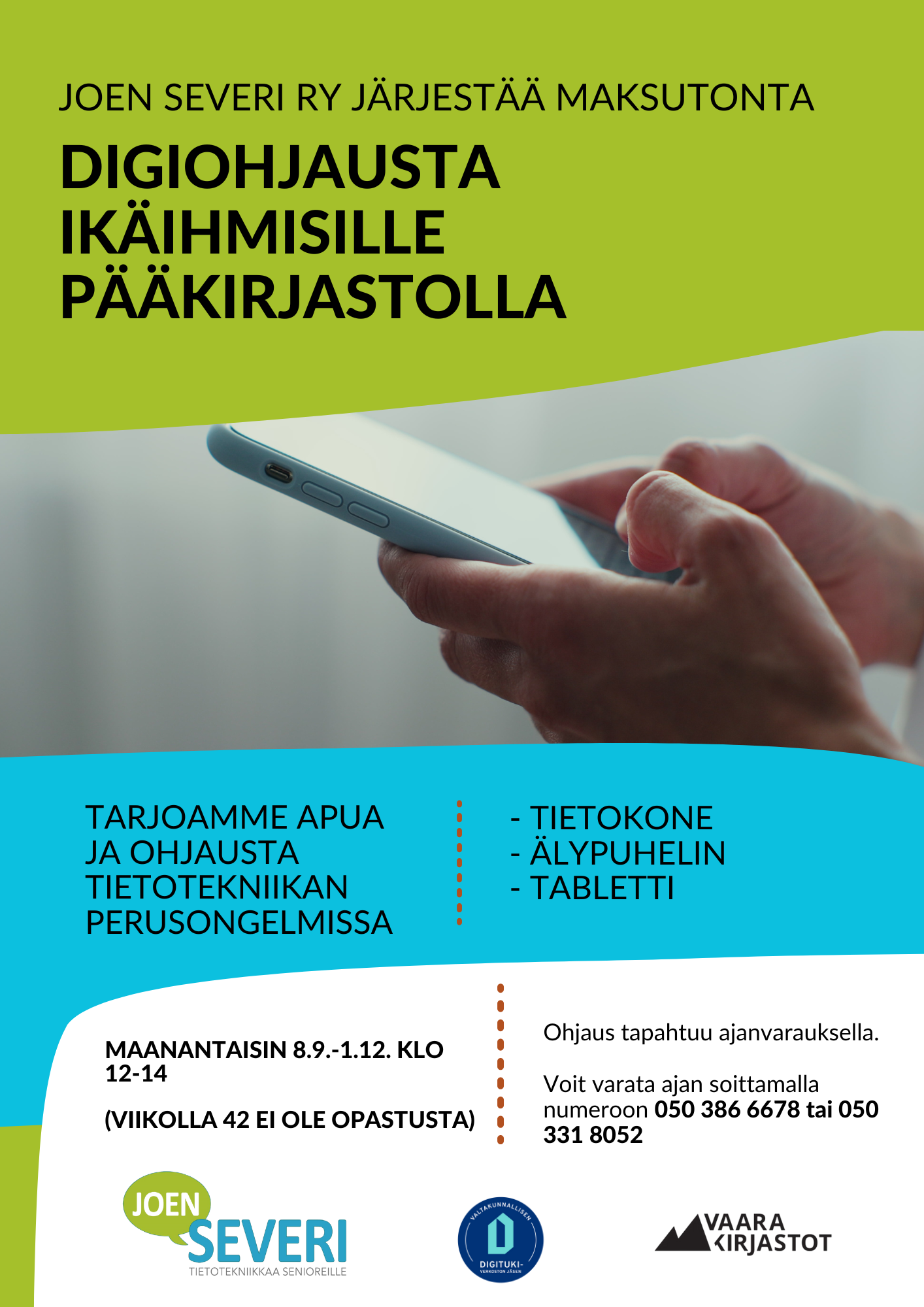 Joen Severi ry tarjoaa digiohjausta Joensuun pääkirjastolla maanantaisin 8.9.-1.12. klo 12-14 (ei viikolla 42)