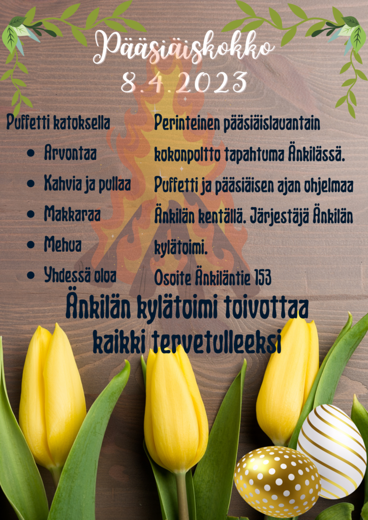 Tervetuloa perinteisille pääsiäistulille Änkilän kentälle pääsiäislauantaina 8.4.2023. Tapahtuma alkaa klo 16.00. Pääsiäiskokko kootaan kentälle pääsiäisviikolla. Eli tänä vuonna meillä poltetaan tapahtumissa kokko sekä keväällä, että syksyllä.