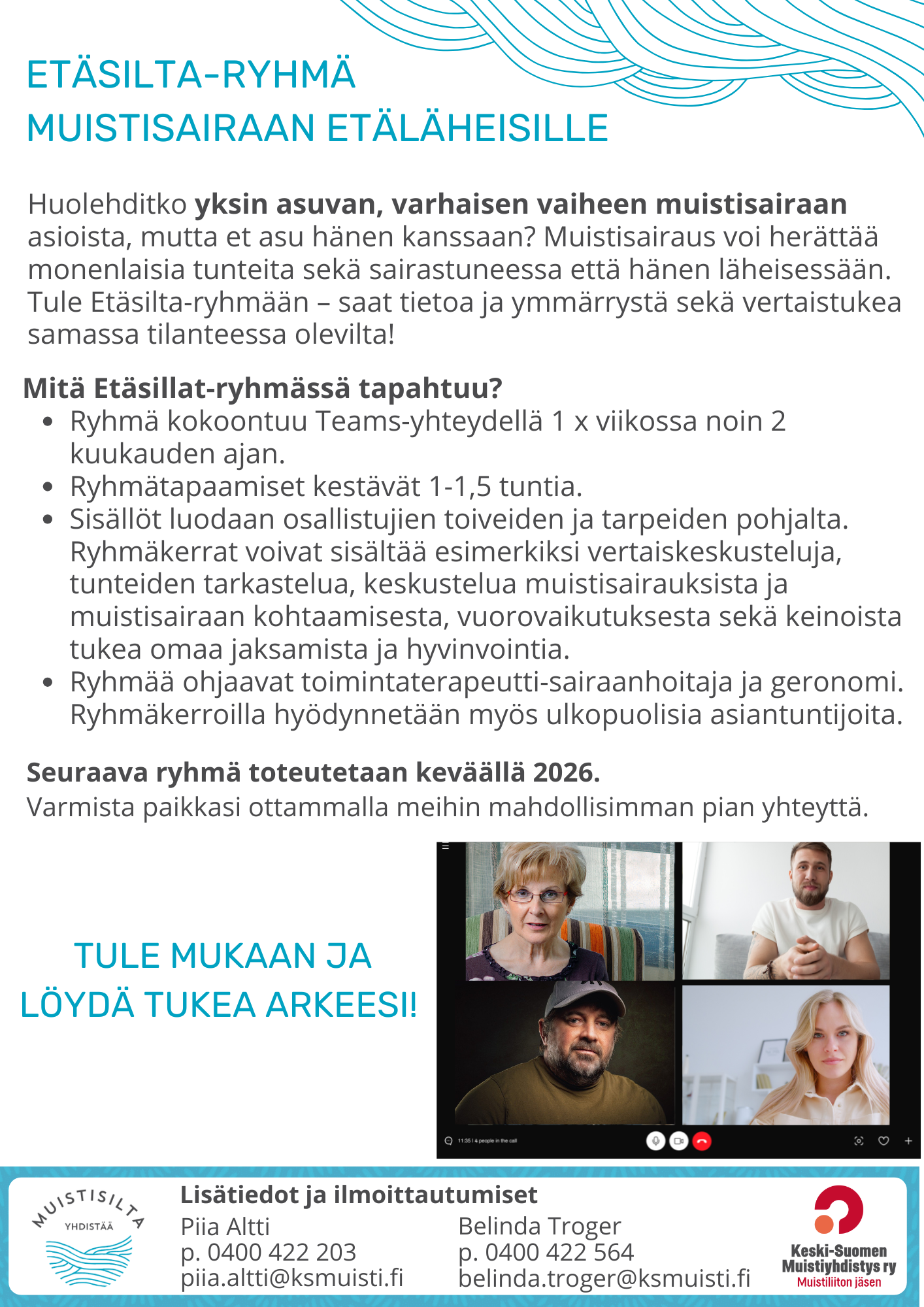 Etäsilta-ryhmä on tarkoitettu henkilöille, jotka huolehtivat yksin asuvan, varhaisen vaiheen muistisairaan arjen sujuvuudesta, mutta eivät asu samassa taloudessa sairastuneen kanssa. Etäläheinen voi olla esimerkiksi lapsi, sukulainen, ystävä tai naapuri. Ryhmään voi osallistua, jos sairastunut ja/tai etäläheinen asuu Keski-Suomessa.