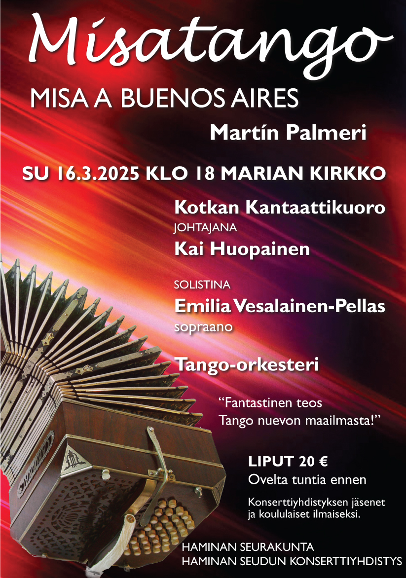 Misatango - Misa a Buenos Aires. Martin Palmerin tangomessu kuorolle, solistille ja orkesterille Marian kirkossa Haminassa.