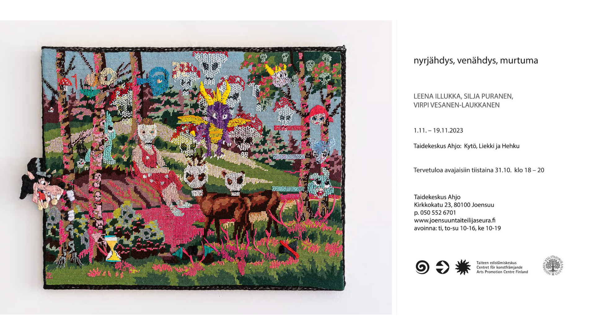 Kolmen taiteilijan ryhmänäyttelyä yhdistää tarinallisuus ja näkökulmat ihmisenä olemiseen. Video- ja tekstiiliteoksista koostuva kokonaisuus kommentoi yhteiskunnassa ja ympäristössä tapahtuvia jatkuvasti kiihtyviä muutoksia, niiden tuottamia nyrjähdyksiä, venähdyksiä ja murtumia. Lähtökohtana työskentelyyn on yksilön suhde luontoon, kulttuuriin ja sosiaalisiin rakenteisiin. Ryhmä on pitänyt näyttelyitä vuodesta 2018 alkaen. Nyt Kytö-, Liekki- ja Hehku -tiloissa on esillä heidän kahdestoista yhteinen näyttelynsä.