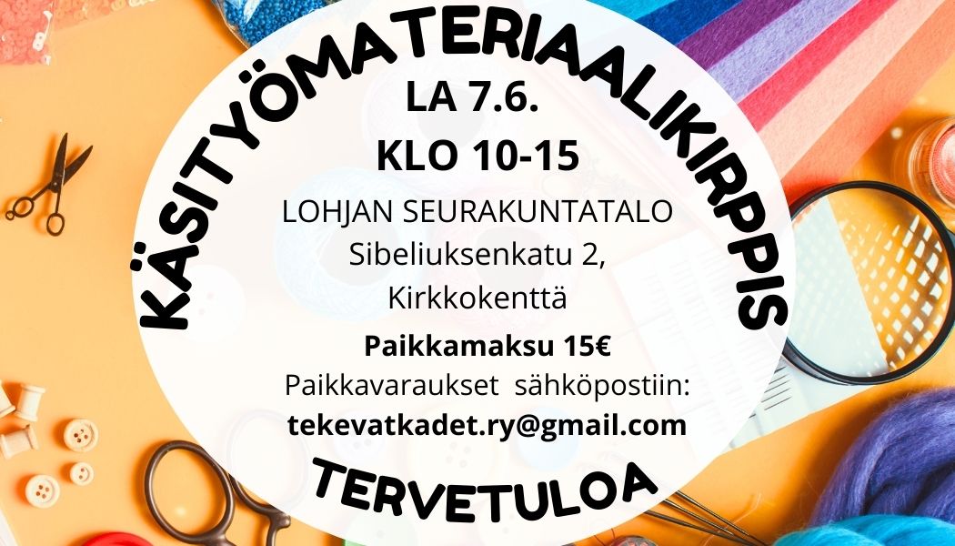 Käsityömateriaalikirppis pidetään la 7.6. Lohjan seurakuntatalon salissa Kirkkokentän vieressä, Sibeliuksenkatu 2. Myyntiaika klo 10-15.