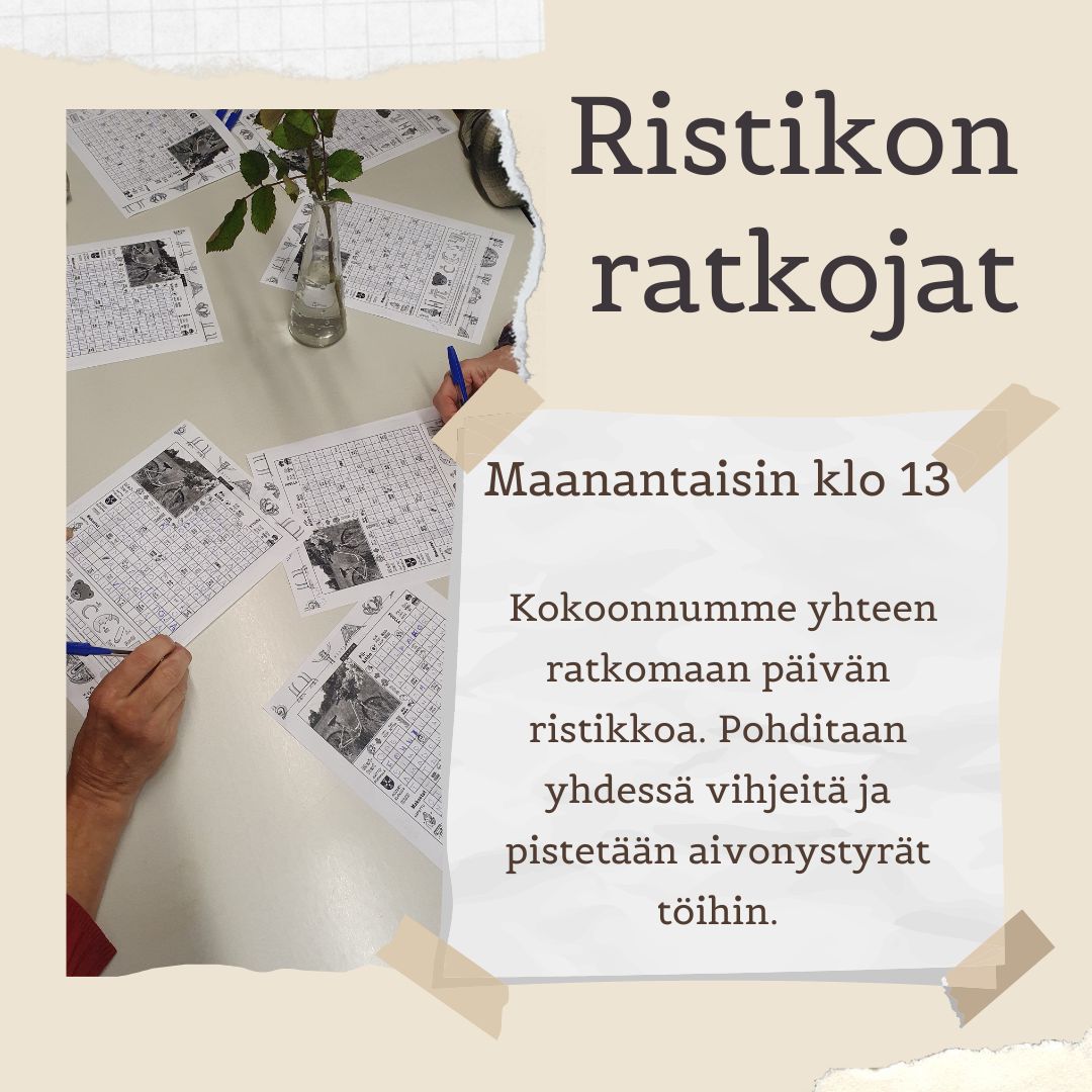 Kylätalo Keitaan ristikon ratkojat ryhmässä kokoonnutaan yhteen ratkomaan päivän ristikkoa. Pohditaan yhdessä vihjeitä ja pistetään aivonystyrät töihin.