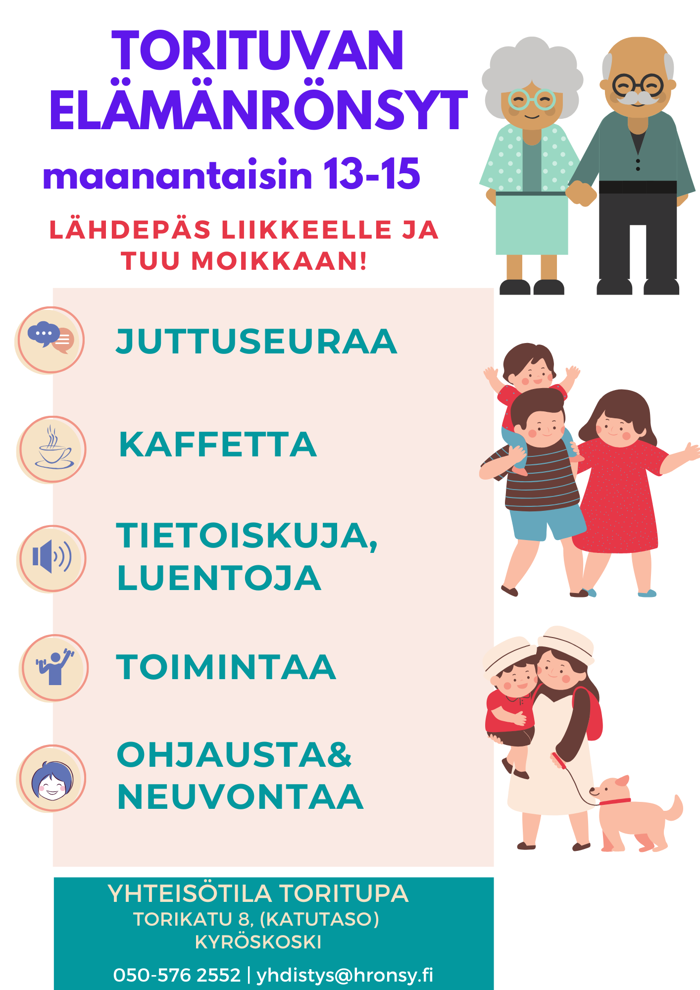 Kaikille avoin, maksuton Torituvan Elämänrönsyt pitää sisällään vaihtelevasti tietoiskuja ja luentoja eri aihealueista. Erilaisia toimintapajoja- ja tuokioita järjestetään kävijöiden toiveita ja tarpeita kuunnellen. Myös asiantuntijaluentoja aika ajoin. Joka maanantai paikalla SPR:n Terveyspiste: terveysneuvontaa, verenpaineen ja verensokerin mittausta. Tavattavissa myös vapaaehtoinen digiohjaaja sekä Pirhan lähitorin palveluohjaaja.