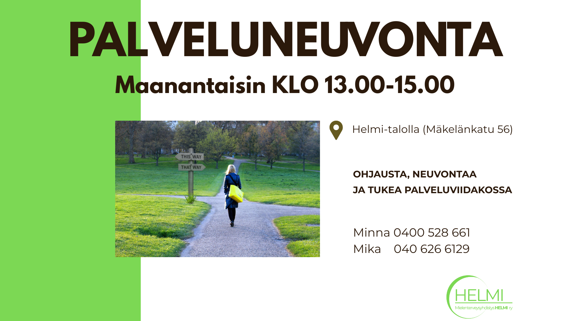 Tarjoamme myös lyhytkestoista palveluneuvontaa, 1–3 tapaamiskerran palveluohjausta. Voit saada neuvontaa ilman ajanvarausta maanantaisin klo 13–15 Helmi-talolla, puhelimitse tai verkkovälitteisesti.