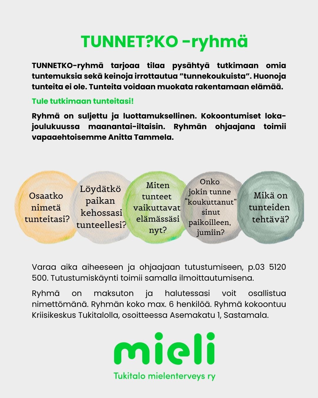 TUNNETKO-ryhmä tarjoaa tilaa pysähtyä tutkimaan omia tuntemuksia sekä keinoja irrottautua ”tunnekoukuista”. Ryhmän koko max. 6 henkilöä.