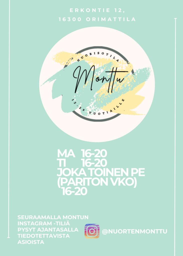Monttu on kaupungin nuorisotila, jossa toimintaa 15-29-vuotiaille ja 12-18 vuotiaille pe 10.10. alkaen joka toinen viikko.