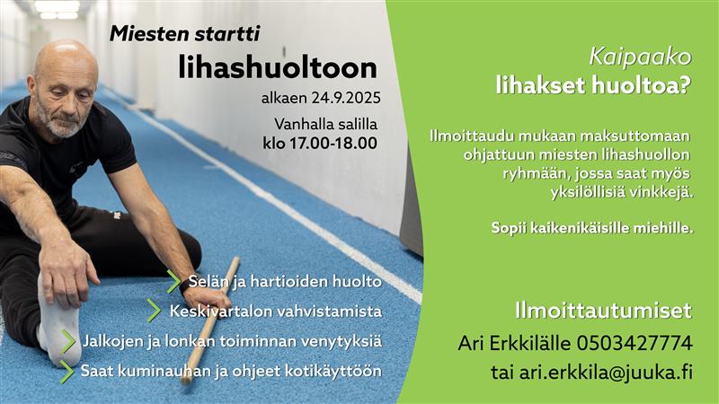 Tule mukaan maksuttomaan, ohjattuun miesten lihashuollon ryhmään, jossa saat myös yksilöllisiä vinkkejä.