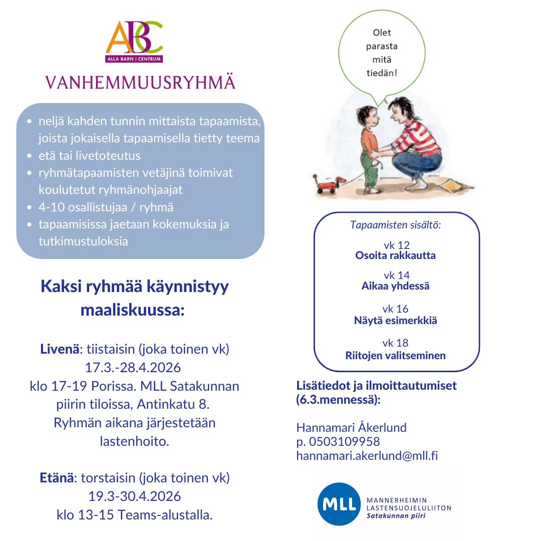 Netti sivuilta löytyy ajankohtaiset tiedot ryhmistä. Perheille - MLL:n Satakunnan piiri