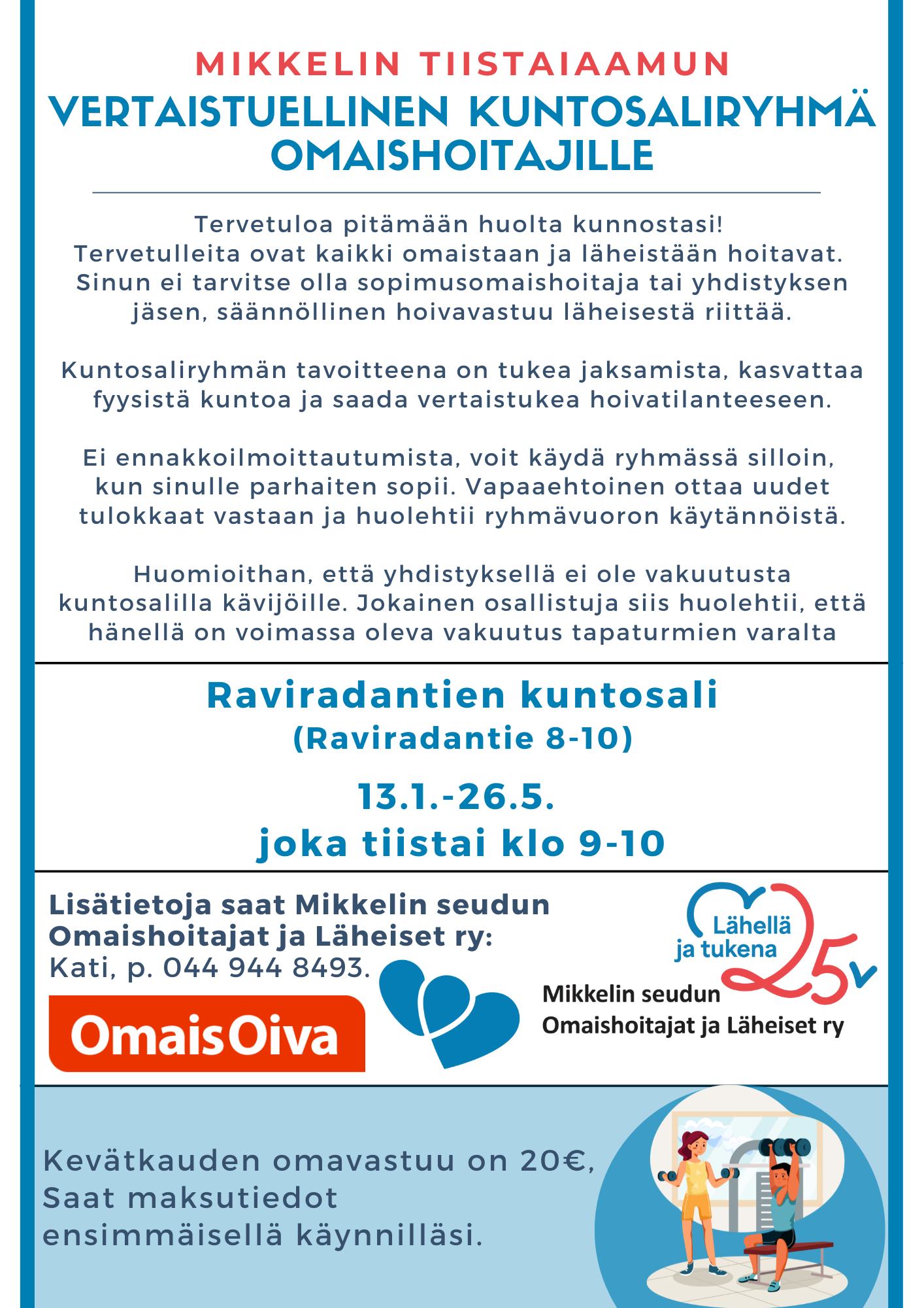 Kuntosalivuoron tarjoaa Mikkelin seudun Omaishoitajat ja Läheiset ry.