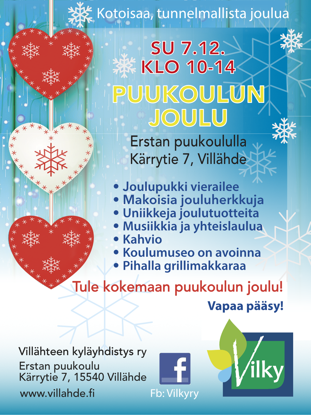 Pukinkontin mitalla jouluista tunnelmaa Lahden Villähteellä Puukoulun joulu -tapahtumassa! Uniikkeja myyntituotteita. Jouluista musiikkia ja yhteislaulua, joulupukki saapuu paikalle klo 10-11. Buffetti. Koulumuseo auki! 120 vuotta vanhan puukoulun idylliä. Vapaa pääsy.