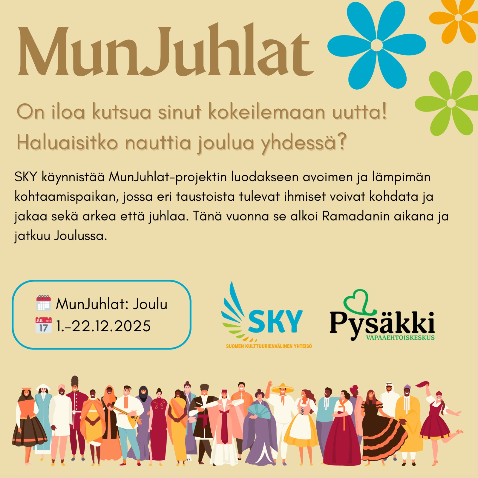 MunJuhlat: Joulu on Suomen Kulttuurienvälinen Yhteisö ry:n (SKY) toteuttama vapaaehtoistoiminta, jonka tavoitteena on tuoda eri kulttuuritaustoista tulevia ihmisiä yhteen joulun aikaan. Toiminta perustuu ajatukseen, että juhlapäivät ovat luonteva ja lämmin tapa kohdata, jakaa tarinoita ja oppia toisiltamme.