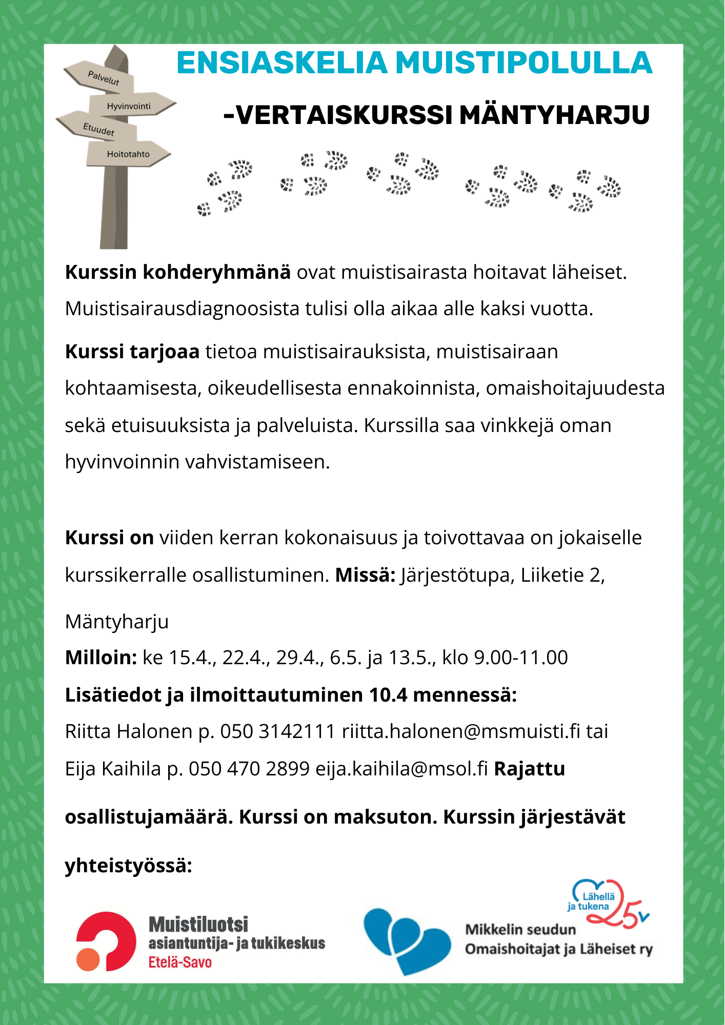 Kurssi järjestetään yhdessä muistiluotsin kanssa. Osallistujien toivotaan olevan muistisairaan läheisen hoivapolun alkutaipaleella.