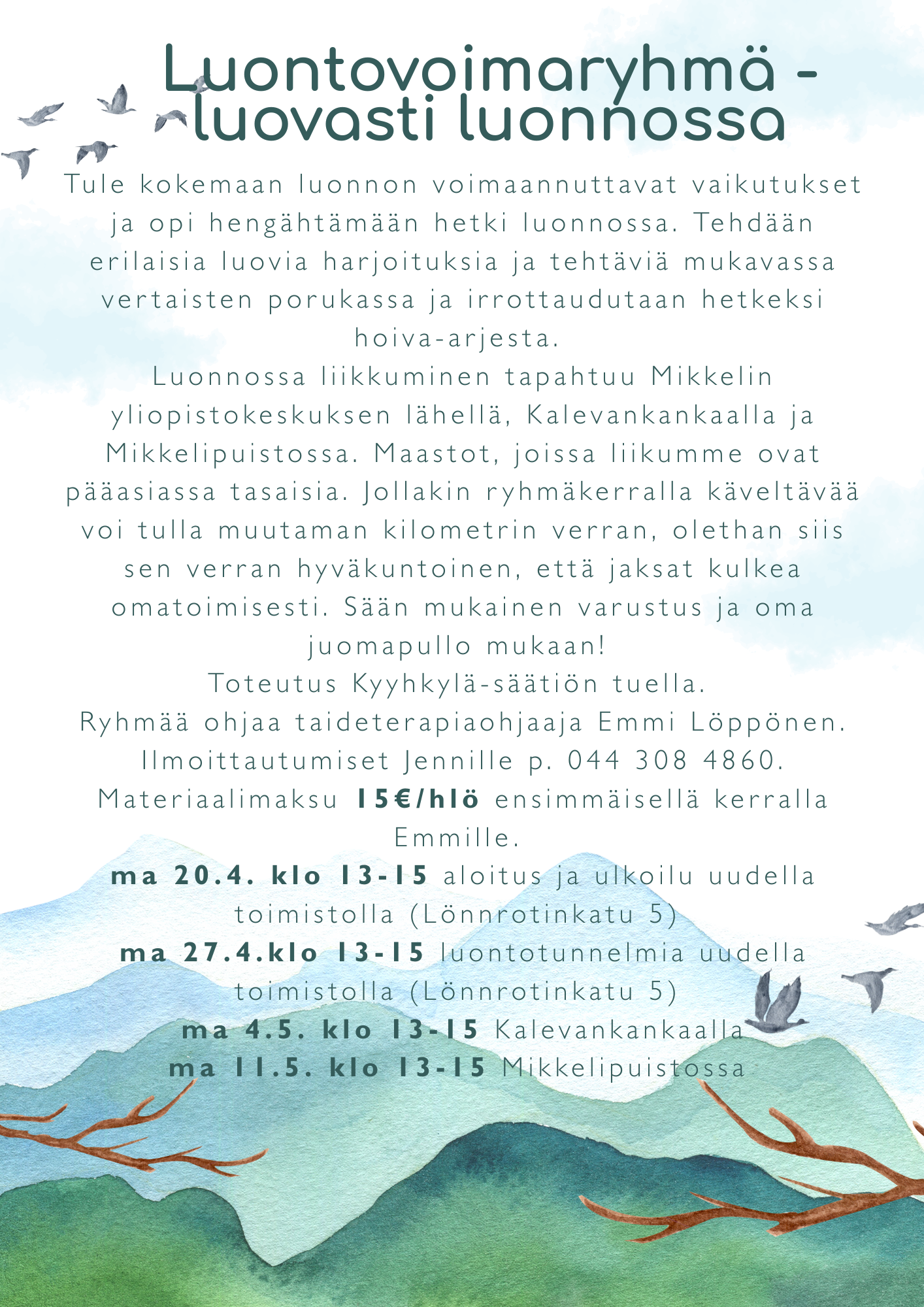 Ryhmää ohjaa taideterapiaohjaaja Emmi Löppönen. Ilmoittautumiset Jennille p. 044 308 4860.