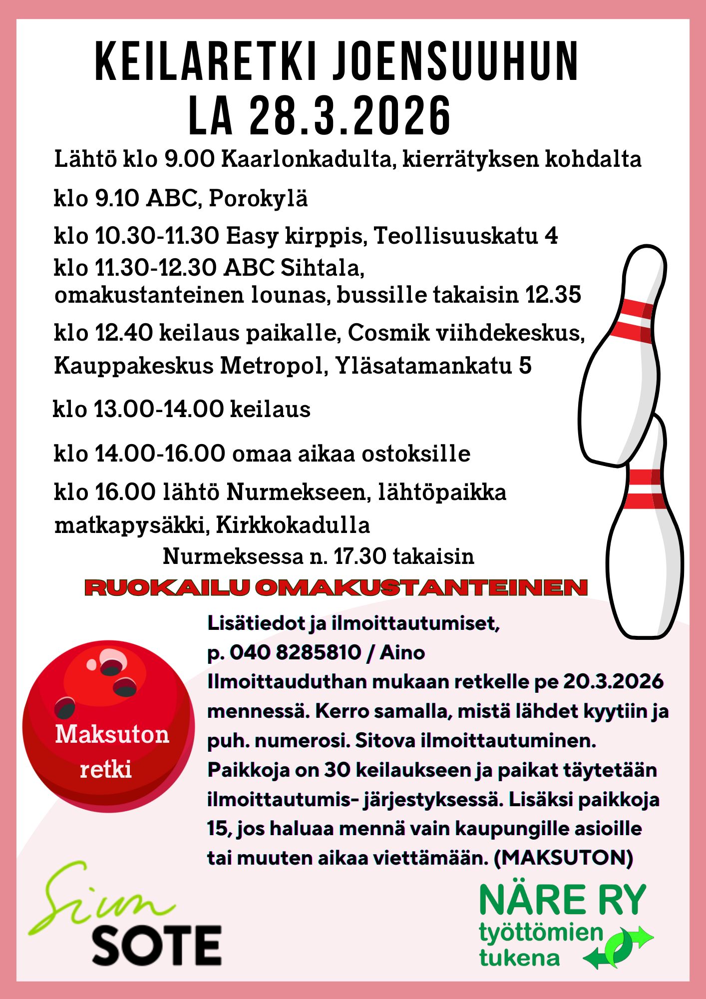 Retki: Easy-kirpputorilla käynti 10.30-11.30, keilaus 13-14 ja ostosaikaa 14-16Joensuussa.