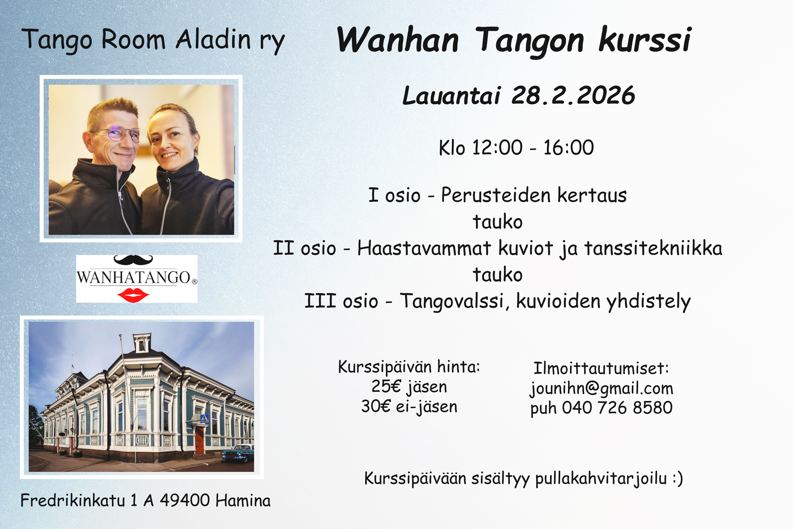 Tällä kertaa perehdymme Wanhaan tangoon ja sen tekniseen osaamiseen vaihtelevien kuvioiden ja kuviosarjojen avulla siten, että loppupäivästä meillä on riittävästi materiaalia kyetäksemme tanssimaan sujuvasti niin tangot, kuin valssitkin.