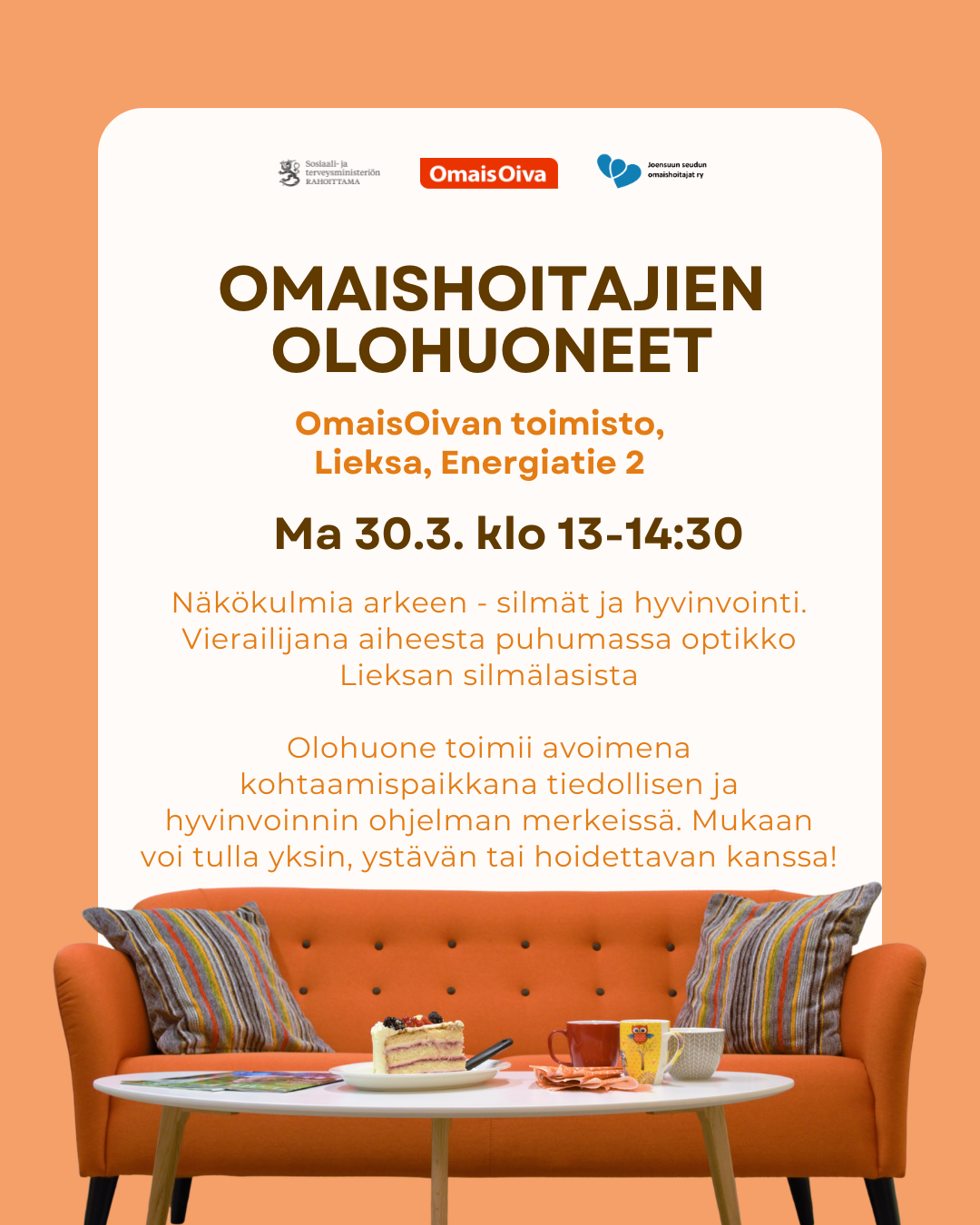 Omaishoitajien olohuone on avoin kohtaamispaikka omaishoitoperheille ja läheistään auttavalle, jonne voit tulla yhdessä hoidettavan tai ystävän kanssa