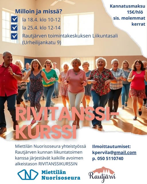 Miettilän Nuorisoseura yhteistyössä Rautjärven kunnan liikuntatoimen kanssa järjestävät kaikille avoimen alkeistason RIVITANSSIKURSSIN. Kurssi järjestetään la 18.4. klo 10-12 ja la 25.4 klo 12-14 Rautjärven Toimintakeskuksen Liikuntasalissa, Urheilijankatu 9. Kurssin ohjaajaksi on lupautunut lajia liki kolmekymmentä vuotta harrastanut ja rivitanssiohjaajaksi kouluttautunut Sanna Hallikainen.