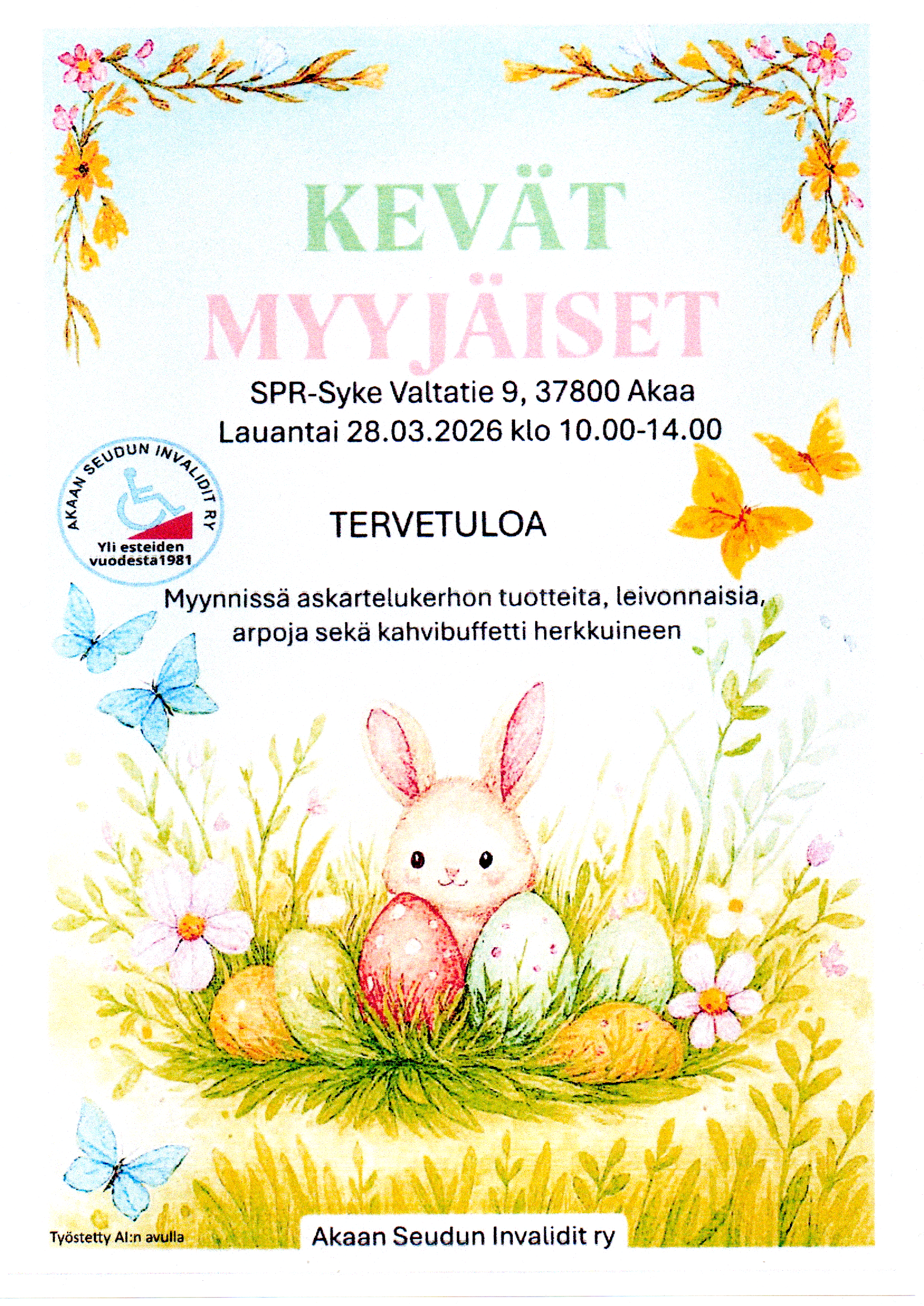Myynnissä askartelukerhon tuotteita, leivonnaisia, arpoja sekä kahvibuffetti herkkuineen.