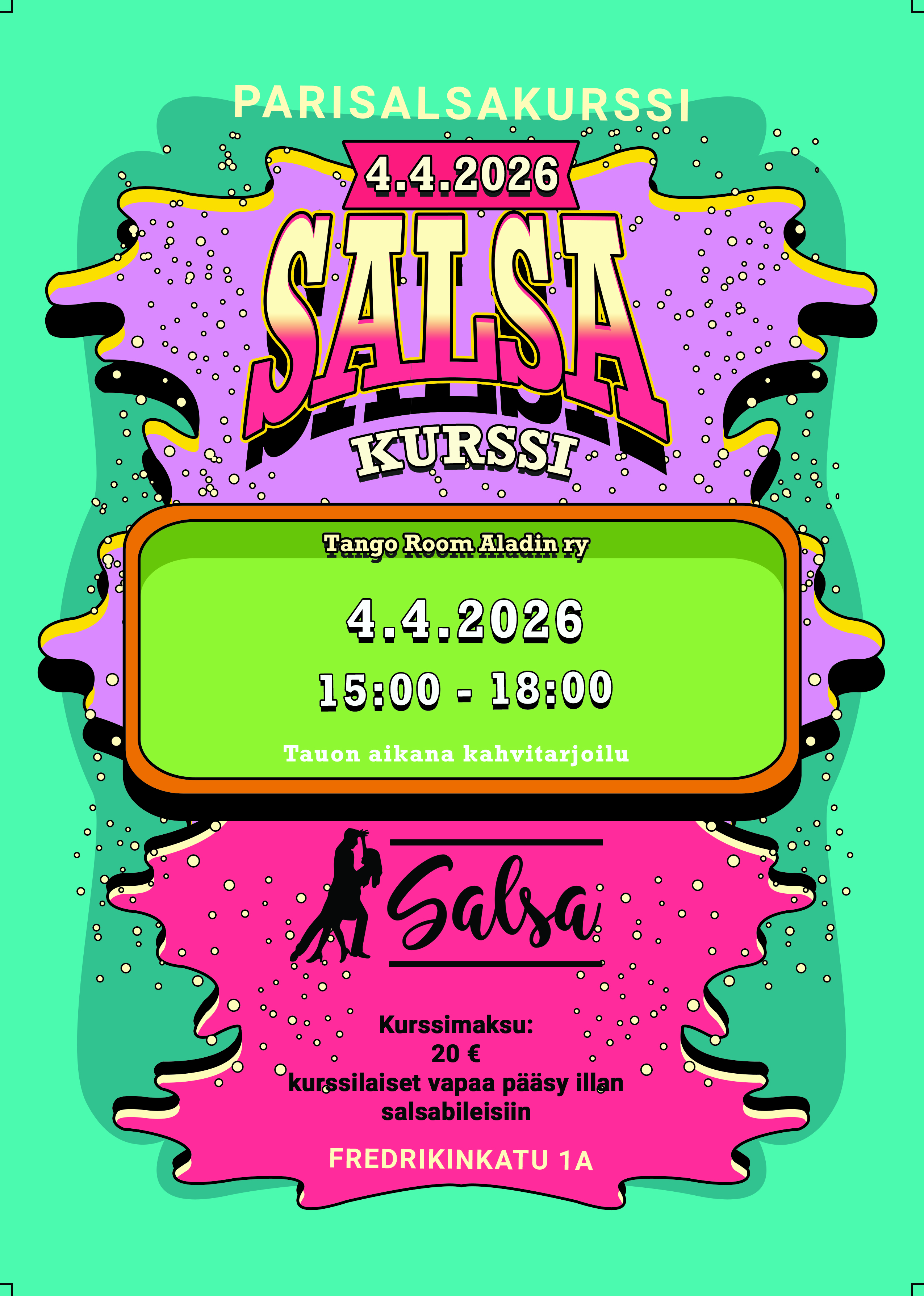 Kurssin oppeja pääset heti kokeilemaan käytännössä Salsa - Partyssa. Tervetuloa tanssimaan, olet sitten vasta-alkaja tai kokenut konkari ja samalla tutustumaan Tango Room Aladin ullakolle meidän riemukkaaseen salsa ryhmään!