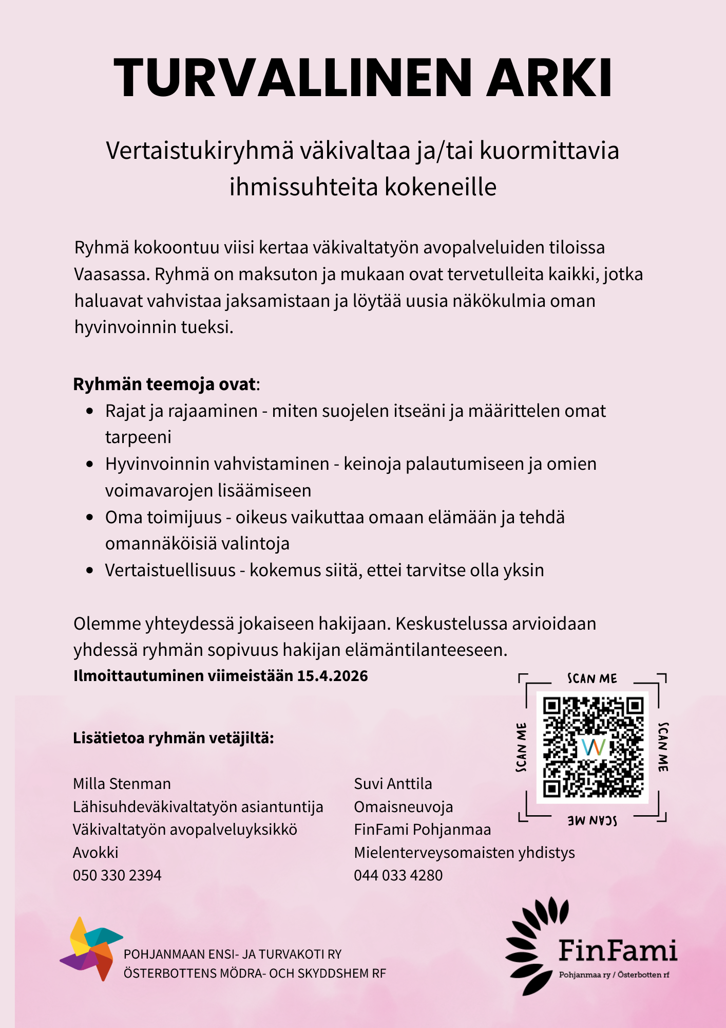 Ilmoittautuminen viimeistään 15.4.2026. Olemme yhteydessä jokaiseen hakijaan. Keskustelussa arvioidaan yhdessä ryhmän sopivuus hakijan elämäntilanteeseen. Ryhmäntapaamisten ajankohdat ilmoitetaan osallistujille.