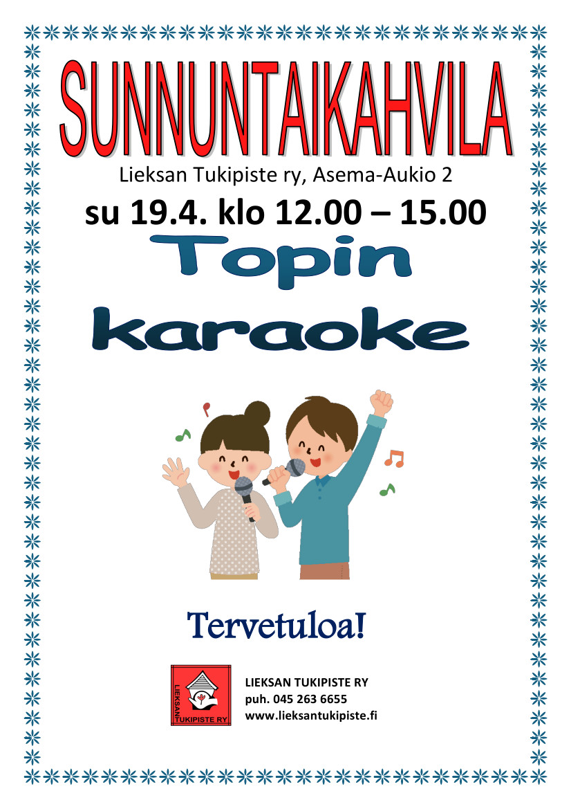 Sunnuntaikahvila 19.4. klo 12.00 -15.00 Topin karaoke. Tervetuloa!