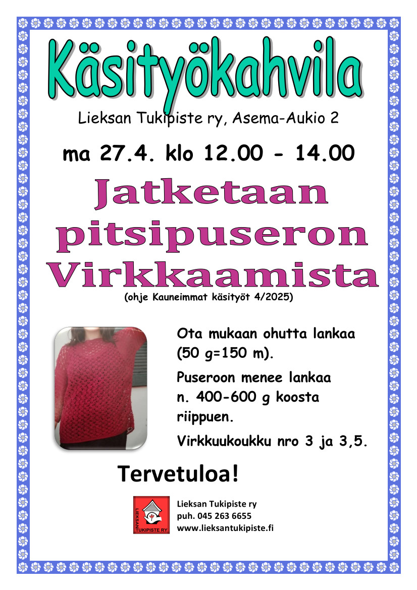 Käsityökahvila 27.4.2026 klo 12.00- 14.00. Jatketaan pitsipuseron virkkaamista. Tervetuloa!