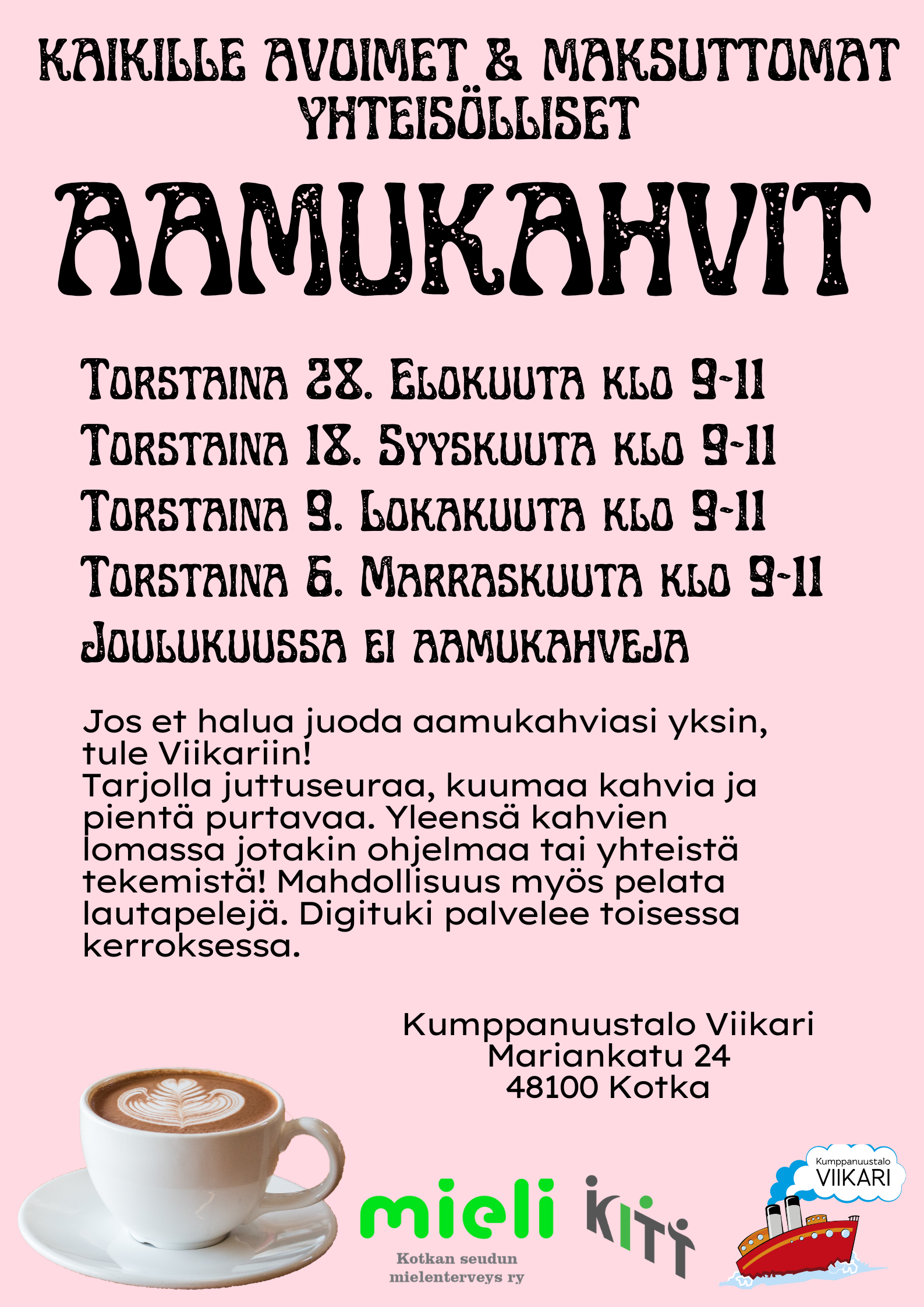 Kaikille avoimet ja maksuttomat Yhteisölliset aamukahvit kerran kuussa torstaisin Kumppanuustalo Viikarilla klo 9-11.
