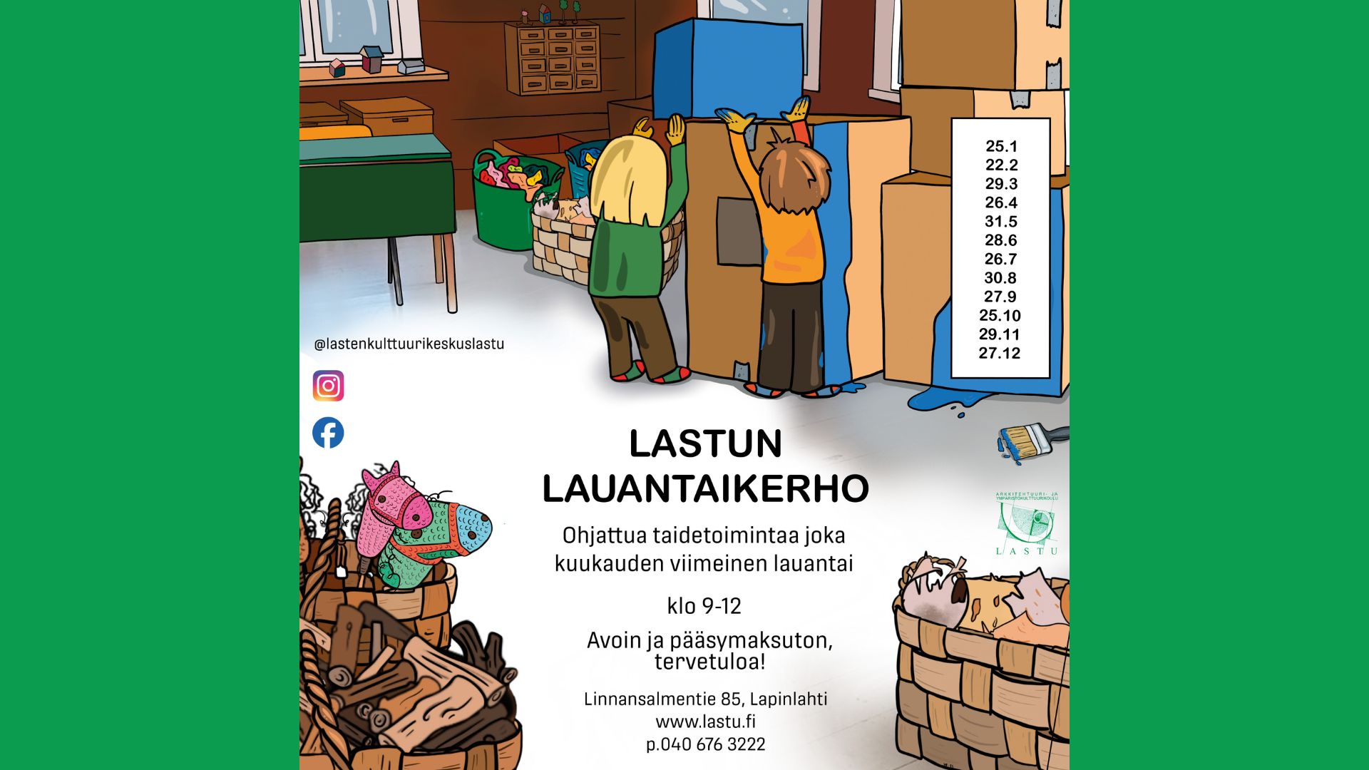 Tänä vuonna alkaa Lastussa uutuutena lauantaikerho: avointa taidetoimintaa koko perheelle joka kuukauden viimeinen lauantai klo 9-12 alkaen 25.1.2025.
