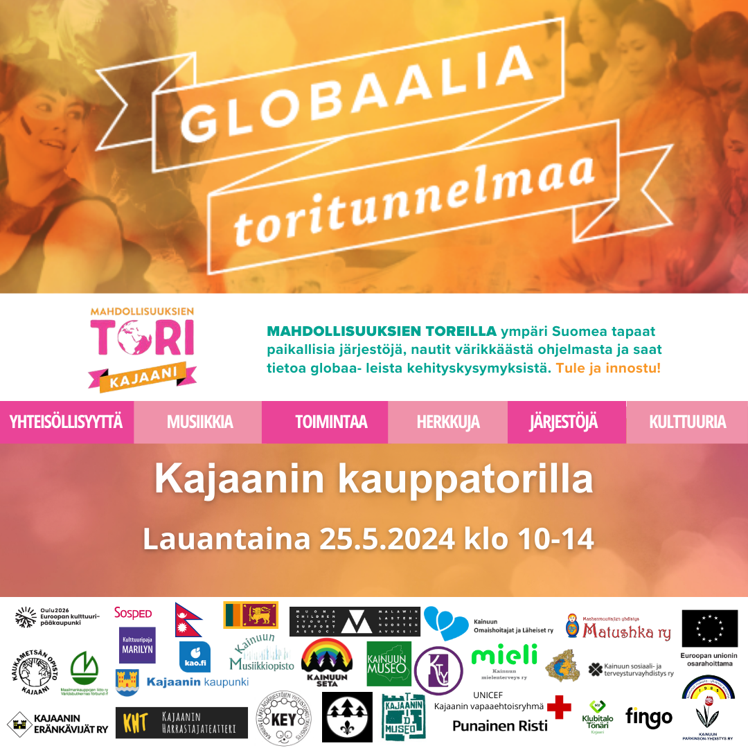 Mahdollisuuksien tori on ilmainen yleisötapahtuma, jonka tavoiteena on lisätä paikkakuntalaisten kiinnostusta globaaleihin kehityskysymyksiin ja tarjota keinoja vaikuttaa.