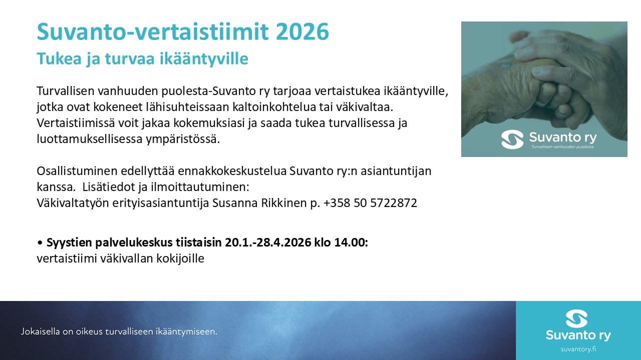 Osallistuminen edellyttää ennakkokeskustelua Suvanto ry:n asiantuntijan kanssa. Lisätietoja ja ilmoittautuminen: Susanna Rikkinen, väkivaltatyön erityisasiantuntija Turvallisen vanhuuden puolesta – Suvanto ry