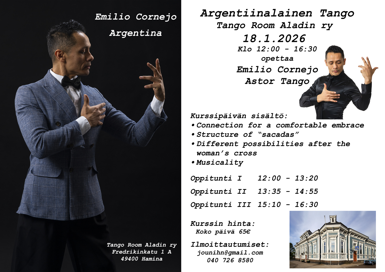 Tammikuun 18. päivä sunnuntaina suuri tanssija ja opettaja Emilio Cornejo / Astor Tango saapuu Tango Room Aladin ry vieraaksi opettamaan syvälle argentiinalaisen tangon ytimeen johtavan kurssijakson ensimmäistä tapaamiskertaa.