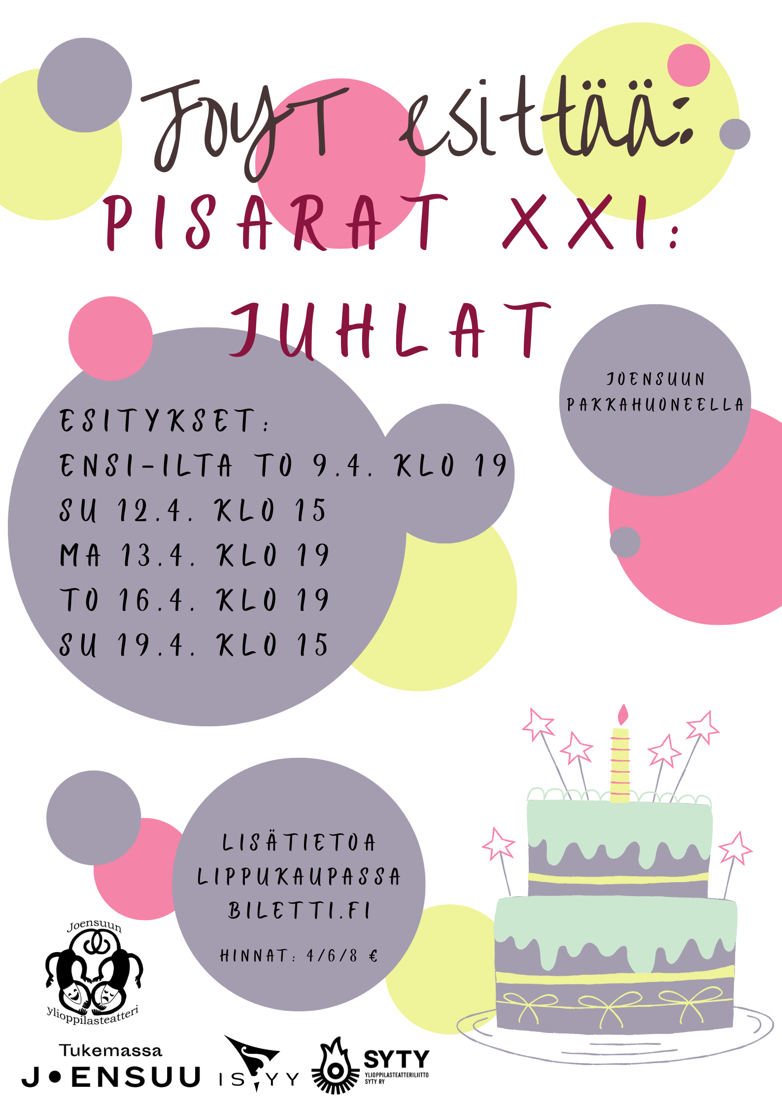 Joensuun ylioppilasteatterin Pisarat XXI: Juhlat - piennäytelmäantologian esitykset Joensuun Pakkahuoneella.