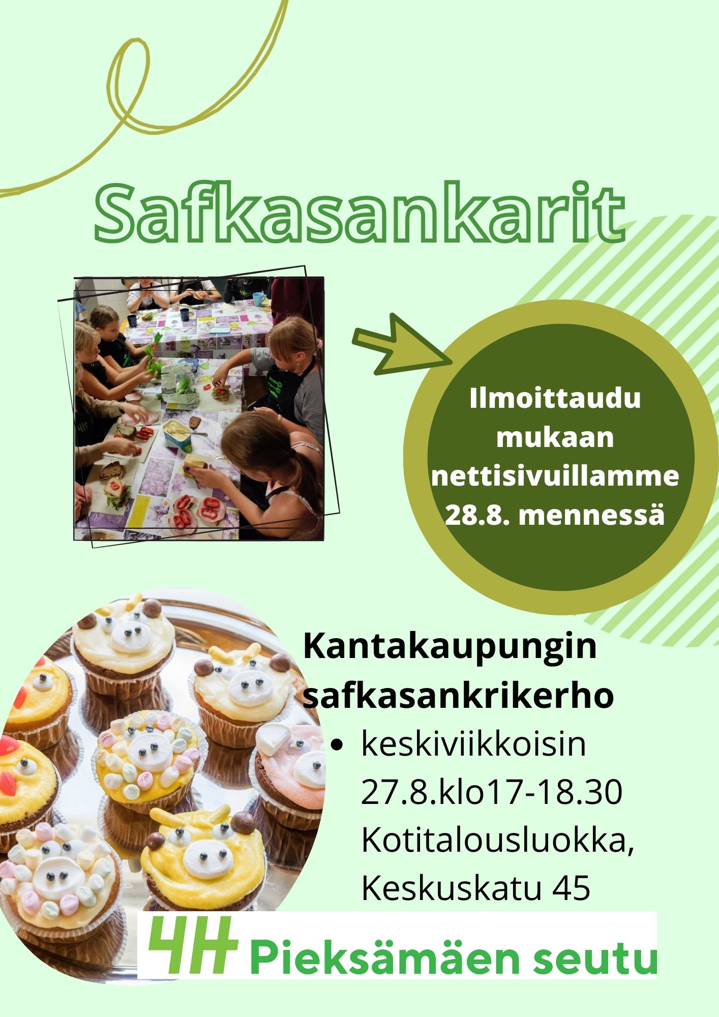 Safkasankarikerhossa leivotaan ja tehdään ruokaa. hyväää läheltä ohjeiden mukaisesti. Viimeisellä kerhokerralla kerholaiset pitävät 4H-kahviota. Kerho ajalla 27.8. 10.12.2025